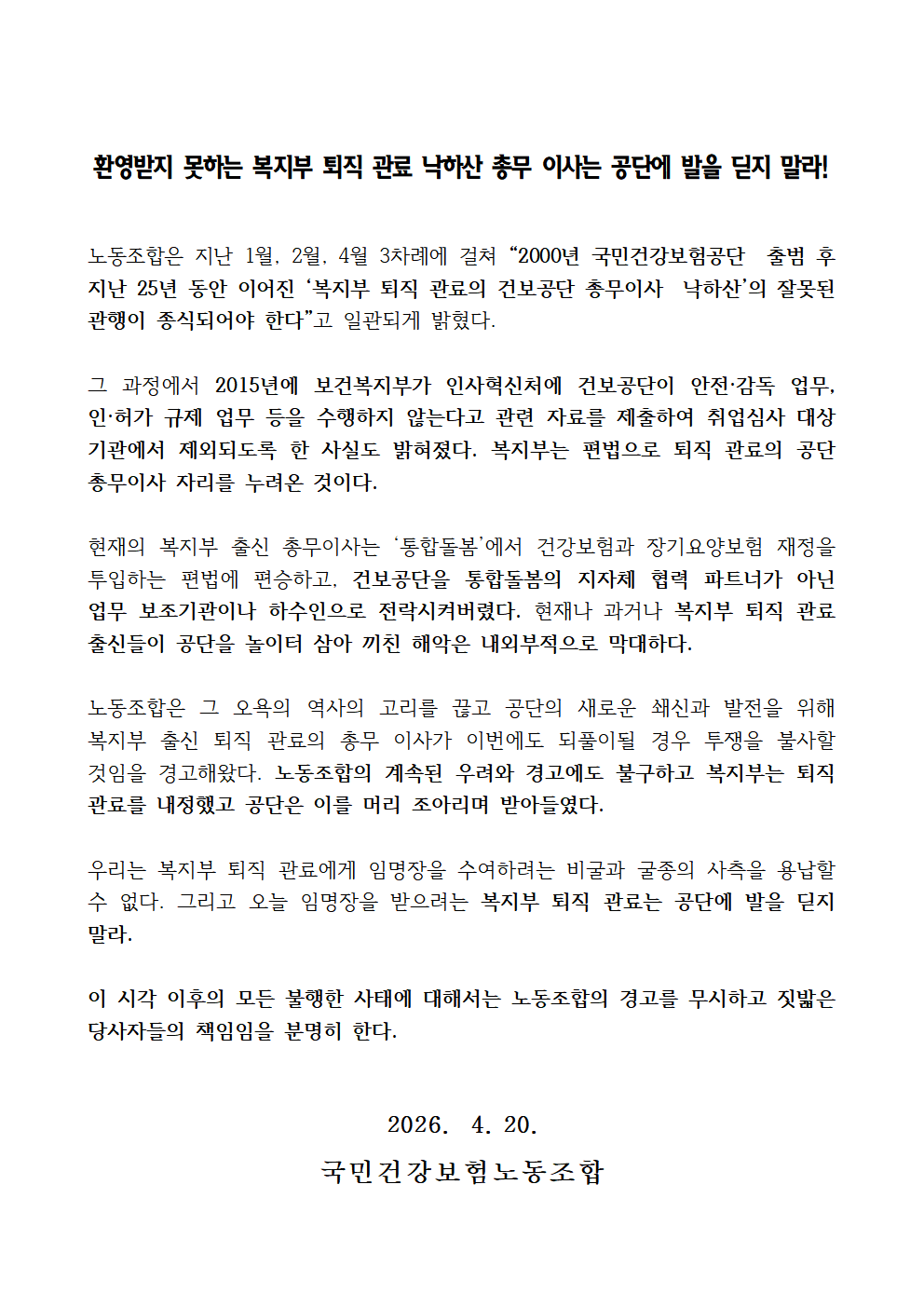 [성명] 환영받지 못하는 복지부 퇴직 관료 낙하산 총무 이사는 공단에 발을 딛지 말라!
